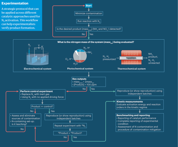 氮是所有生命形式所必需的元素之一,但氮气分子极为惰性,其还原为氨或氧化为氮氧化物皆需要克服较大的动力学阻力。目前氮气的活化转化主要依赖以Haber-Bosch工艺为主导的工业合成氨过程,该过程反应条件苛刻、耗能高、CO2排放量大,因此亟需升级换代。近年来,以可再生能源驱动的绿色N2活化转化方式,即低压低温热催化合成氨、(光)电催化氮还原和氮氧化等受到学术界和工业界的广泛关注。这些研究目前存在很大的挑战性,尤其是(光)电催化合成氨反应中,NH3的产量和选择性均较低,这使得产物的定量分析较为困难,文献报道的结果往往存在一定的准确性与可重复性的问题。因此,建立一套严格的实验方法十分必要。